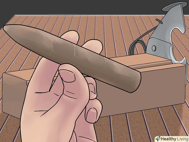 Нанесіть останні штрихи. залишилося виконати останню операцію − висушити сигару на сушильній рамі протягом 24-48 годин. Просохнувши, Покривний лист щільно обтягне сигару. Однак перед сушінням ви можете зробити ще дещо, щоб надати сигарі більш досконалий вигляд.- Зріжте виступаючий край, помістивши сигару в Ніж для обрізки кінчиків. Ніж для обрізки кінчиків сигари дозволяє з точністю обрізати кінчик (ніжку) сигари перед курінням. Таким чином ви додасте сигарі відповідну довжину. Кінчик сигари можна обрізати і за допомогою гострого кухонного ножа.
