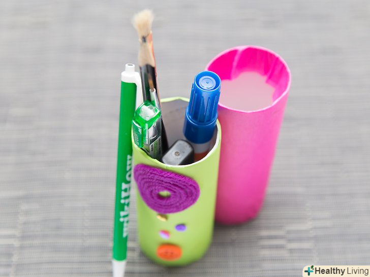 Пляшка з-під шампуню. Не викидайте пляшку, коли витратите весь кондиціонер або шампунь. Вимийте і обріжте ємність, щоб використовувати в якості підставки. Зніміть з неї кришку і зріжте верхню чверть пляшки. Якщо пляшка занадто висока або низька, тоді регулюйте висоту на свій розсуд. Використовуйте ножиці або канцелярський ніж. Тепер пляшку можна прикрашати! [3]- Якщо пляшка не повністю кругла, то вона буде не особливо стійкою. Таку підставку можна повісити на стіну. Використовуйте текстильну застібку. Одну частину прикріпіть до пляшки, а другу закріпіть на стіні. Спробуйте повісити пляшку-підставку над столом.