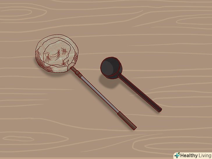 Дістаньте предмети для збору водорості. Колонія спіруліни здається щільною, але вона в основному складається з води. Коли вона буде готова до вживання або для інших цілей, вичавіть з неї зайву воду. Якщо ви хочете зібрати лише невелику кількість спіруліни, візьміть фільтрувальну тканину або сито з дрібними отворами. Крім цього вам також знадобиться спеціальний совок, щоб діставати спіруліну з акваріума. [3]- Якщо ви хочете зібрати більше спіруліни для сушіння, візьміть тканину або сито б Про льшіх розмірів.