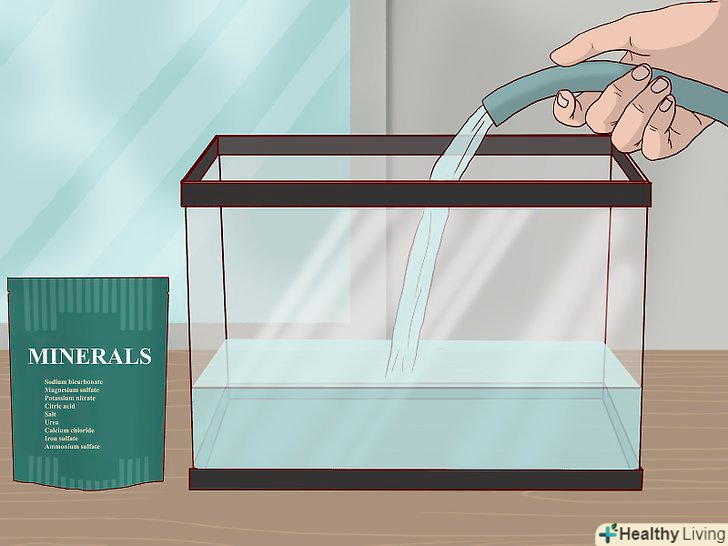 Підготуйте живильне середовище. місце, в якому ростуть водорості, виробники спіруліни називають «живильним середовищем», але по суті це лише вода в акваріумі з мінеральними добавками. Налийте в акваріум фільтровану воду, а потім додайте в неї стільки мінеральної суміші, скільки сказано в інструкції на упаковці. [7]- Встановіть фільтр на кран (наприклад, Аквафор) і наберіть для акваріума воду з-під крана.