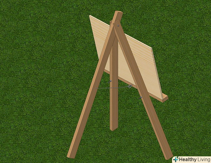 Завершуємо роботу над мольбертом, встановивши його вертикально в зручну позицію. кріпимо мотузку, яка буде обмежувати розсування ніг один від одного більше, ніж необхідно. Прикріпіть один кінець мотузки до поперечки, а другий, протягнувши через отвір в задній нозі, закріпіть.