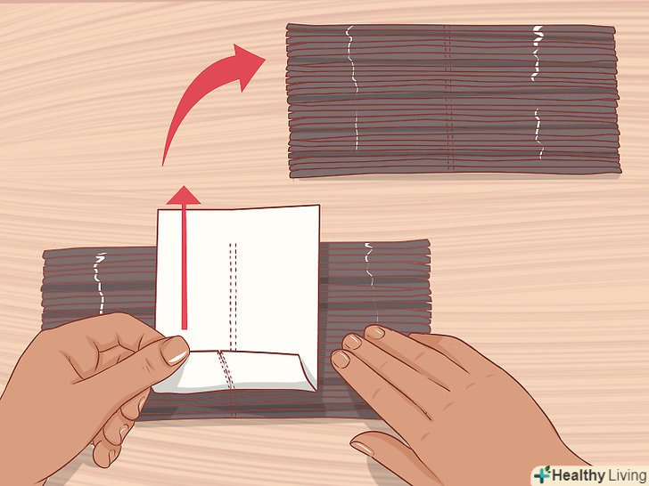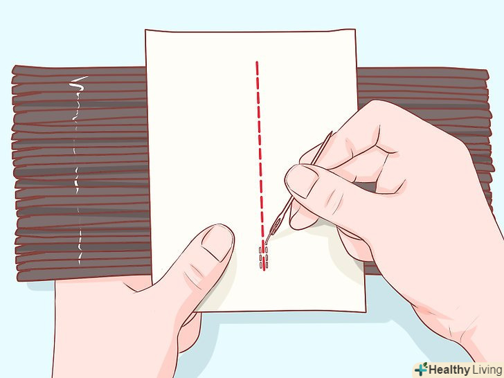 Пришийте пряжу до паперу. рухайтеся по середині цигаркового паперу і пришийте всі нитки. Шов повинен пройти вертикально по центру паперу, щоб вийшла пряма лінія, що проходить в центрі через всі шари конструкції. Частини волосся з обох сторін повинні сходитися в середині і утримуватися нитковим швом. [8]- Якщо ви добре керуєтеся з голкою, то можна зшити пряжу вручну. Також можна працювати зі швейною машинкою, щоб отримати максимально прямий шов.