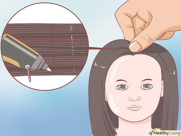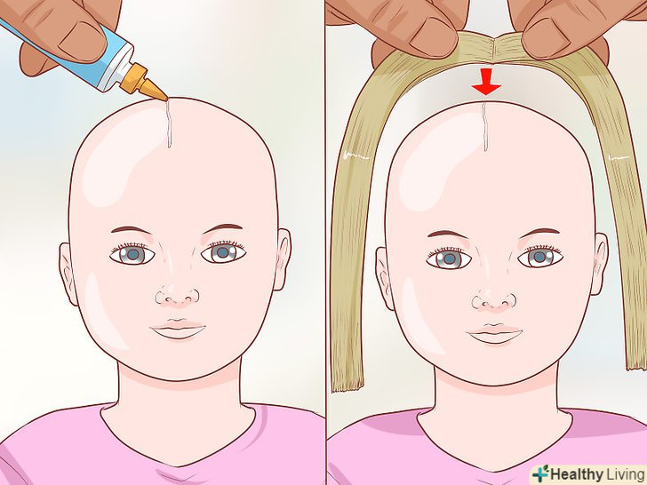 Приклейте волосся до голови ляльки. тепер необхідно прикріпити волосся до голови. Використовуйте універсальний клей для пластмасових ляльок і гарячий клей для ганчіркових виробів. Клею не повинно бути багато, інакше він просочиться через волосся і вийдуть неакуратні вузлики. Волосся будуть триматися навіть при невеликій кількості клею. [18]- Нанесіть тонку смужку універсального клею по центру голови ляльки. Притисніть центральну лінію волосся (де розташовувалася голка) до смуги клею, щоб ця смуга утворила проділ. Потім дочекайтеся, поки клей висохне.