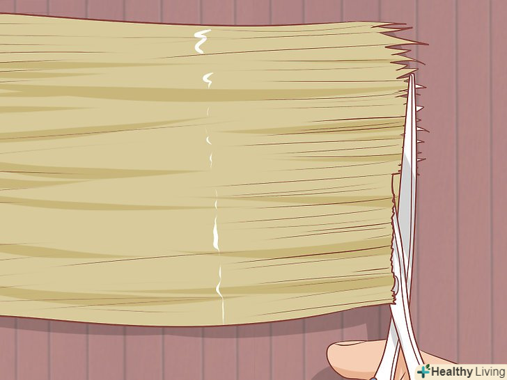 Зафіксуйте пряжу на цигарковому папері. відріжте тонкий шматок цигаркового паперу розміром приблизно 10 на 20 сантиметрів. Розкладіть папір на плоскій поверхні. Розташуйте склеєну частину пряжі на папері так, щоб смуги стрічки були паралельні довгій стороні. Складіть цигарковий папір поверх склеєного ділянки пряжі, щоб затиснути нитки між шарами паперу. [7]- Папір повинна виявитися посередині довгих ниток пряжі. Тепер це вже схоже на волосся. Майбутній проділ волосся пройде по цигарковому папері.