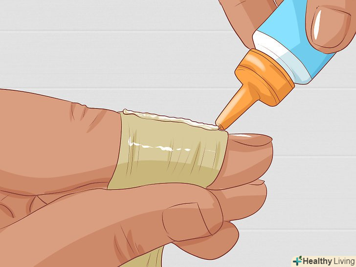 Нанесіть клей по центру волосся. щільно обмотайте волосся навколо вказівного і середнього пальців, щоб центр пасом виявився на ребрі вказівного пальця. Нанесіть тонкий шар універсального клею поперек волосся. Постарайтеся нанести клей на кожну волосинку. [15]- Якщо вам складно нанести клей прямою лінією, то зверніться за допомогою до одного. Іноді дуже складно тримати волосся однією рукою, а другий управлятися з клеєм.