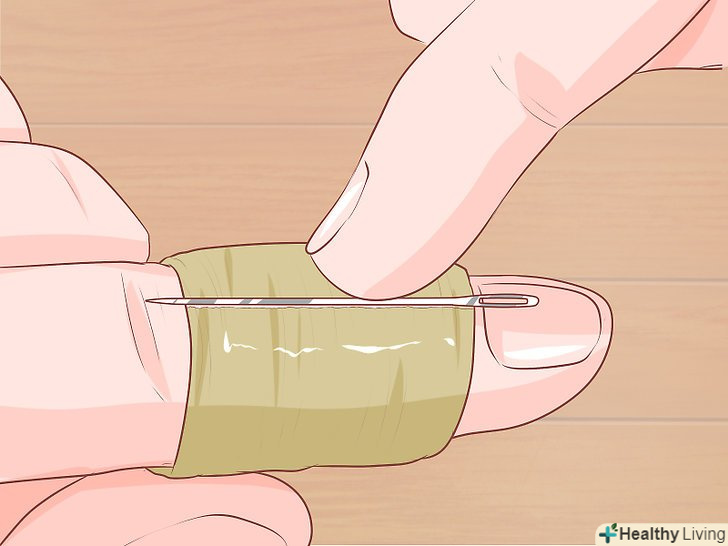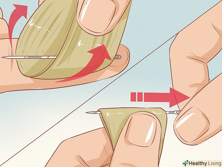Притисніть до лінії клею швейну голку. притисніть швейну голку по лінії нанесеного клею до того, як він висохне. Стискайте волосся під голкою максимально близько до металу. Така дія дозволить клею рівномірно просочитися по матеріалу і склеїти кожну волосинку. Не прибирайте голку, поки клей не висохне. [16]- Таке завдання може виявитися непосильним для однієї людини. Якщо вам складно утримувати однією рукою голку, а другий волосся, то зверніться за допомогою до одного.