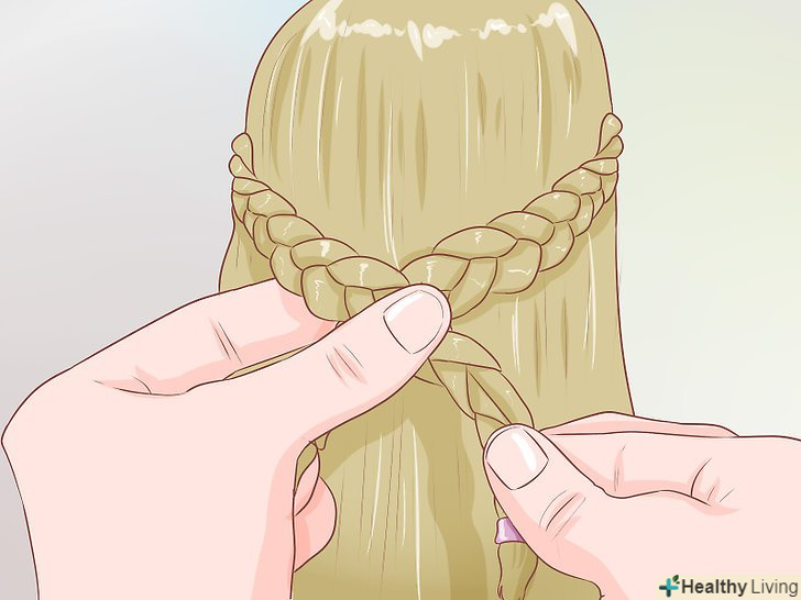 Прикріпіть збоку меншу пасмо. Візьміть меншу пасмо волосся. Довжина проділу становить 3-5 сантиметрів. Повторіть дії, щоб приклеїти або пришити волосся до голови ляльки, тільки тепер розташуйте проділ трохи зліва або праворуч від центру скальпа. Ще один шар пряжі додасть волоссю додатковий обсяг. [12]- Якщо під волоссям просвіщається значна частина голови ляльки, то додайте ще один шар волосся. Зробіть ще одну велику пасмо і закріпіть по центру голови, щоб розташувати нитки внахлест.