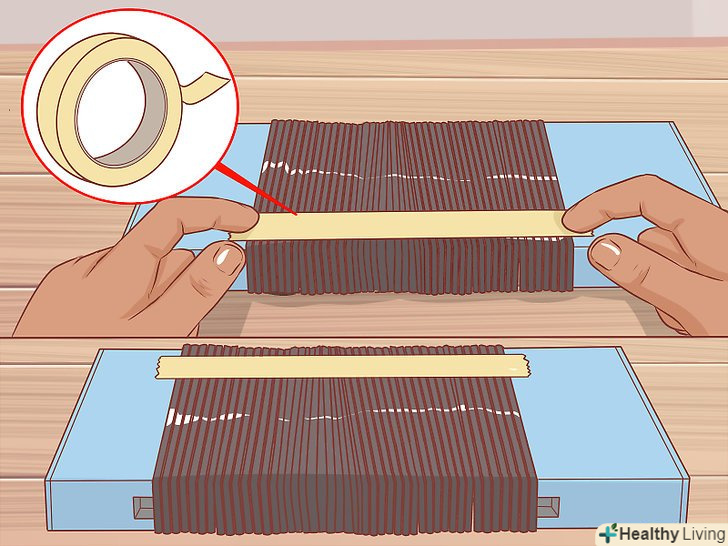 Приклейте пряжу клейкою стрічкою. Завершіть намотування на коробку і візьміть дві довгих смуги клейкої стрічки. Приклейте пряжу до коробки біля гладкої сторони, помістивши клейку стрічку поверх всіх ниток і притиснувши до пластику. Пряжу слід надійно зафіксувати. [5]