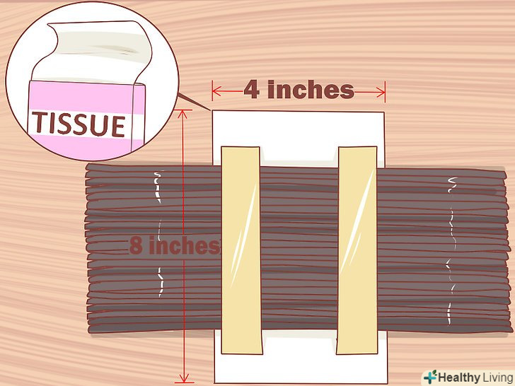 Повторіть операцію з меншою кількістю пряжі. повторіть весь процес ще раз. Ширина намотаною на коробку пряжі не повинна перевищувати 3-5 сантиметрів. [10]- Знову зафіксуйте кінець пряжі клейкою стрічкою, якщо нитки норовлять зміститися.