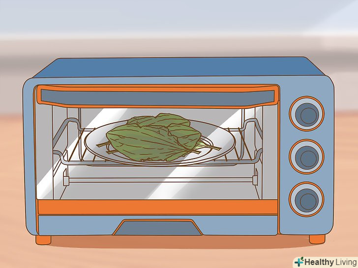 Висушіть великий, товстий лист в мікрохвильовій печі. покладіть товстий лист між двома шарами паперових рушників на тарілку в мікрохвильову піч. Поставте всередину тарілку і маленьку чашку з водою і включіть на 30 секунд [4] . Якщо лист ще не висох, знову включіть на 10 секунд і так далі, перевіряючи лист між включеннями. [5]- Увага: лист може легко спалахнути в мікрохвильовій печі, тому вдаватися до такого методу можна тільки для великих, товстих листя. Чашка з водою допомагає запобігти загорянню, тому що частина енергії мікрохвильової печі витрачається для нагріву води.