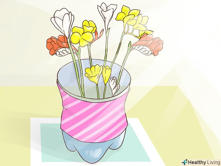 Зробіть вазу для квітів. це відмінний спосіб прикрасити будинок, а також зробити гарний подарунок своїми руками. Щоб зробити квіткову вазу, обріжте верхню частину пляшки складаним ножем. Приклейте яскраву обгортковий папір (можна приклеїти білий папір або повсть) до нижньої половини. Прикрасьте дно наклейками, маркерами або чимось ще. Тепер просто заповніть пляшку водою і поставте квіти.