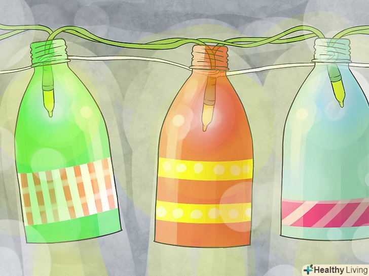 Зробіть світлі пластмасові плафони. їх досить легко зробити, і вони будуть відмінно висвітлювати будинок або ділянку. Щоб їх зробити, потрібно просто відрізати ножицями або складаним ножем нижню частину порожніх пляшок (потрібно близько 5-10 пляшок об'ємом 1 літр). Верхні половини пляшок можна прикрасити акриловою або прозорою скляною фарбою і прикрасити красивою стрічкою (як вам більше подобається). Потім зніміть кришку пляшки і покладіть всередину кожної пляшки по лампочці від гірлянди. Після цього ножем виріжте невеликий отвір поруч з кришкою пляшки і через нього протягніть дріт від гірлянди. [12]