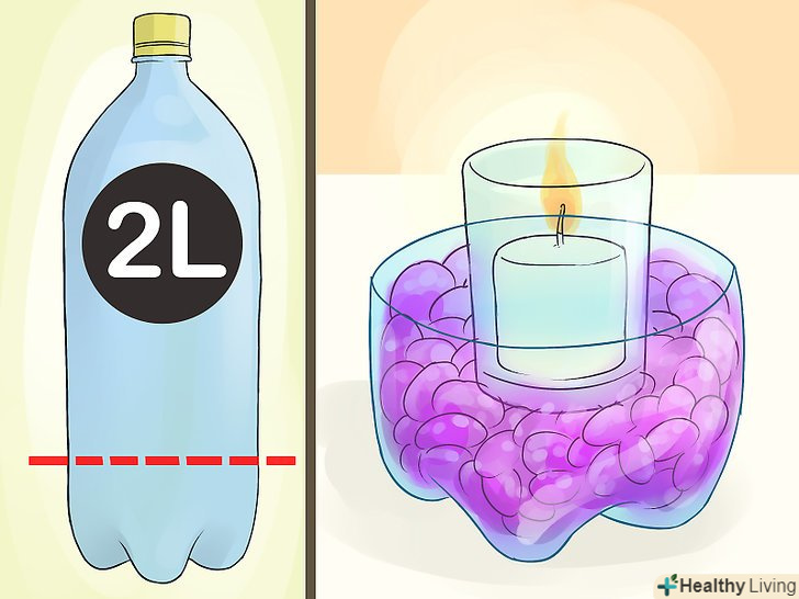 Зробіть свічник. відріжте підставу дволітрової порожньої пляшки за допомогою складаного ножика і заповніть його доверху піском, галькою або якимись красивими каменями. В середині цього контейнера помістіть невелику свічку, щоб вийшов свічник. [7]