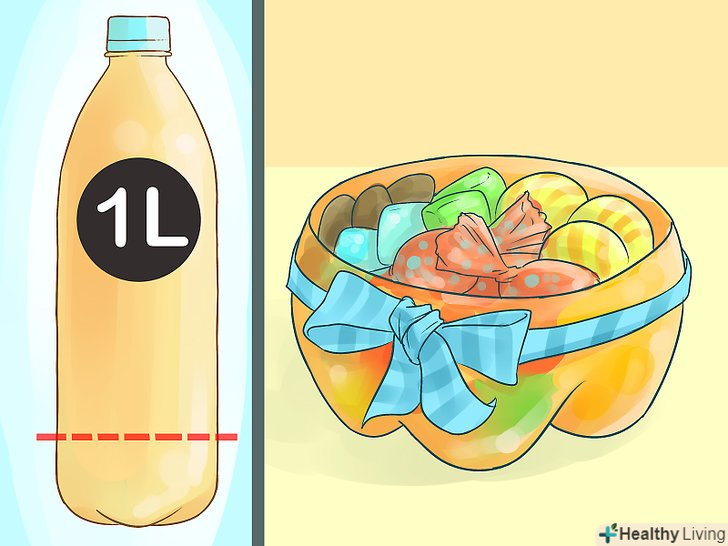 Зробіть вазочку для цукерок або контейнер для канцелярського приладдя. цей спосіб найкраще працює з однолітровою пляшкою з водою. Все, що вам потрібно зробити – це відрізати нижню частину пляшки складаним ножиком, щоб залишилася тільки нижня частина близько 3-5 см.Закруглите обрізану частину, щоб випадково не порізатися гострим пластиком, потім можна прикрасити її. Заповніть вийшло» блюдце " цукерками або канцелярськими предметами, наприклад, гумовою стрічкою, скотчем, затискними кнопками. [8]