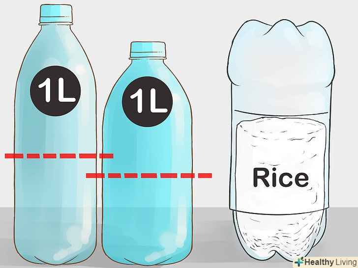 Зробіть контейнер для їжі. найкраще це виходить зробити з однолітровой пляшки з-під води. Щоб перетворити порожню пляшку в контейнер для продуктів, просто візьміть дві пляшки різної висоти і розріжте їх посередині ножем. Потім заповніть більш глибоку частину рисом, квасолею, цукром або будь-якими продуктами, які не швидко псуються, потім накрийте вийшов контейнер підставою іншої пляшки. [9]- Можна розрізати пляшку ножицями або складаним ножем. Міцно візьміть пляшку і повільно обертайте її. Будьте обережні, щоб не порізатися!