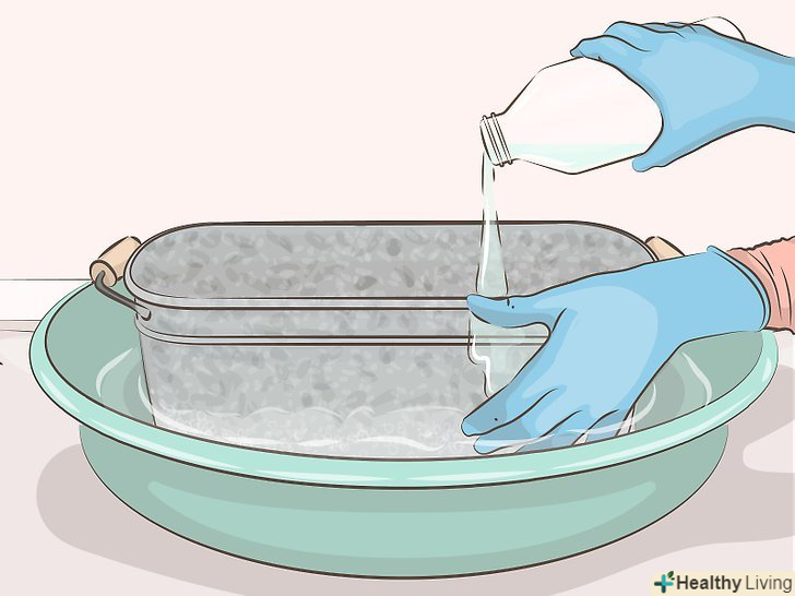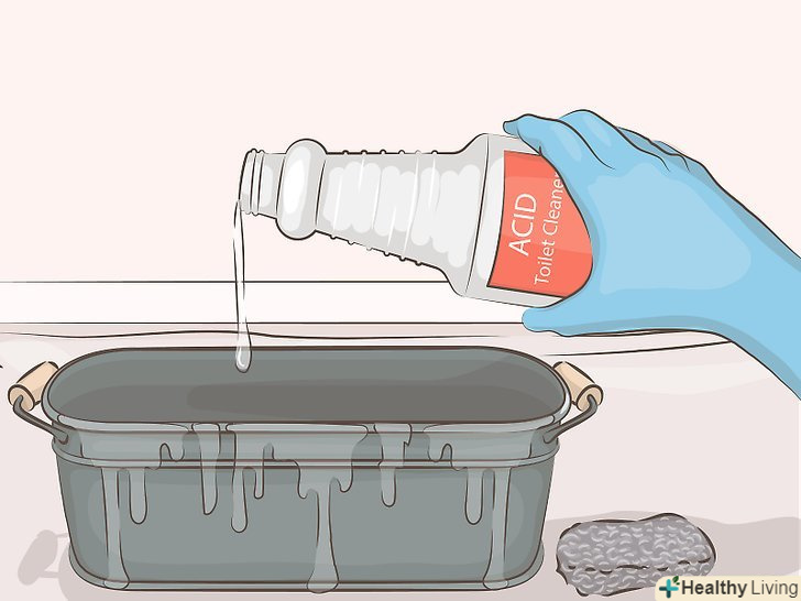 Працюйте в приміщенні з хорошою вентиляцією або на вулиці. можна також підстелити лист пластмаси для захисту робочої поверхні від хімічних речовин.- Одягніть захисні окуляри, рукавички та сорочку з довгими рукавами. Очищувач для унітазів є досить агресивним засобом. У разі прямого контакту він може роз'їдати одяг, а також викликати роздратування шкіри і очей.