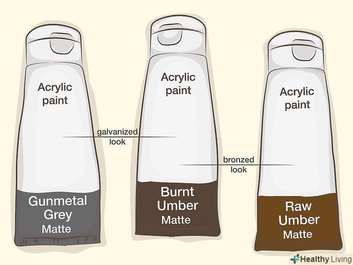 Підберіть акцентні кольори. для додання оцинкованого вигляду купуйте матову фарбу збройового сірого кольору або і паленої умбри. Для додання бронзового вигляду краще вибрати матові акрилові фарби кольору паленої і натуральної умбри.- Не обов'язково фарбувати різними кольорами в кілька шарів. Для додання металу старого оцинкованого виду можна нанести губкою фарбу кольору збройового сірого. Потім подумайте, чи варто додати фарбу кольору паленої умбри і скільки саме. [2]