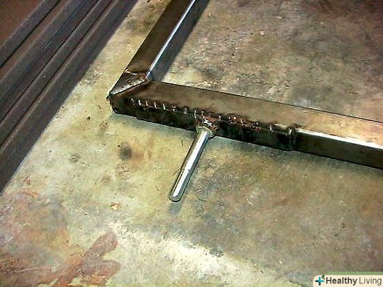 - Прикріпіть 19-ти міліметрові болти, які будуть служити в якості шарнірних шпильок . Спочатку приваріть по шматку 6-ти міліметрової пластини до рами зверху і знизу в місцях, де будуть шарніри. А болти приваріть до цих пластин, для додаткової фортеці. Після, обріжте болт, залишивши 5 см довжини. Отримані Шарнірні шпильки будуть входити в кріплення на стелі і підлозі, які ви встановите пізніше.