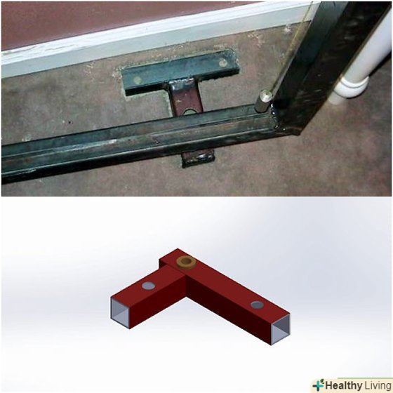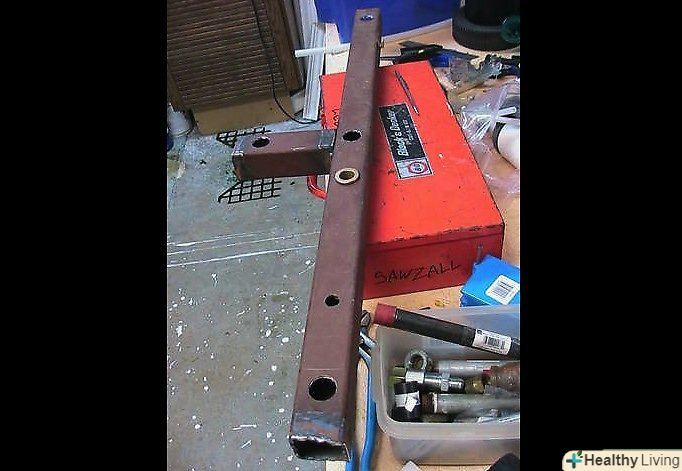 - Виготовте стельове кріплення . Для цього ідеально підійде шматок сталі в якому вже є отвори для шарнірних шпильок. За розміром кріплення повинно бути таким, щоб охопити 3 балки. Додайте до кріплення невелике плече, що виходить в іншу сторону, для того, щоб уникнути розгойдування. Плече, як і саме кріплення, можна зробити з непотрібного шматка сталі. Бажано використовувати трубу квадратного перетину. Плече має рівно продовжувати основну балку інакше воно, розгойдуючись, може виламати кріплення. Отвір для шарніра зробіть з латунного фланцевого підшипника діаметром 19 мм, вставленого в отвір діаметром 25 мм. Сама ж труба, бажано, щоб була розміром 5x5 см