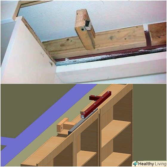 - Поставте книжкові полиці і прикріпіть окантовку навколо шафи . Щоб виміряти зазор між стелею і окантовкою, можна використовувати пластикову карту. З того боку дверей, яка ближче до петель, окантовку слід встановити на сусідній, нерухомої секції шафи, в той час як окантовка з іншого боку, повинна відкриватися разом з усією секцією. Якщо горизонтальна частина оббивки при відкритті виявляється під оббивкою правої секції, то можна трохи сточити край окантовки справа. При необхідності, злегка закруглите горизонтальні частини, щоб вони гладко входили одна під іншу.