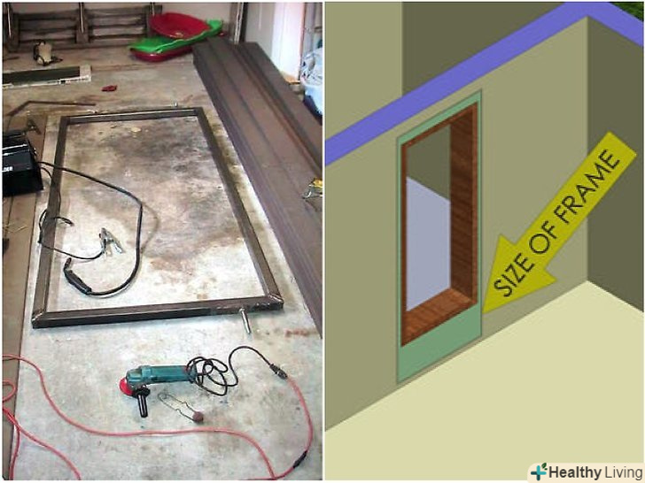 Зваріть сталеву раму, на якій буде триматися секція з полицями. Не вішайте на петлі саму секцію. Сталева рама, зроблена з труби квадратного перетину дозволить двері відкриватися легко і зможе без проблем витримати вагу до 450 кг.- Розрахуйте Розмір рами . По ширині, вона повинна точно закривати двері. Висота повинна забезпечити мінімальну відстань від підлоги до оббивки і самої полиці і достатню відстань від стелі для того щоб вмістити раму прямо під стельовим плінтусом.