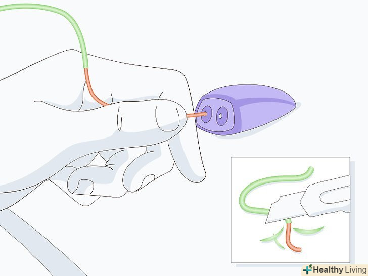 Просуньте дріт через форсунку.якщо шпилька виявилася занадто короткою, щоб очистити засмічення в форсунці, залізьте під капот і від'єднайте шланг в нижній частині форсунки. Після цього протягніть тонкий дріт через нижню частину форсунки вгору до сопла. Якщо сопло має кілька отворів, протягніть дріт кілька разів, поки не прочистіть обидва отвори.[4]- Гітарні струни ідеально підходять для цього завдання, оскільки володіють достатньою жорсткістю, щоб пройти через форсунку.