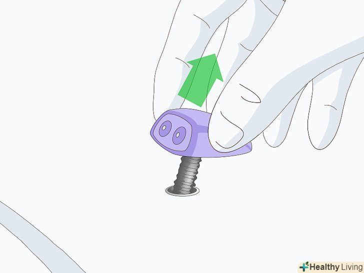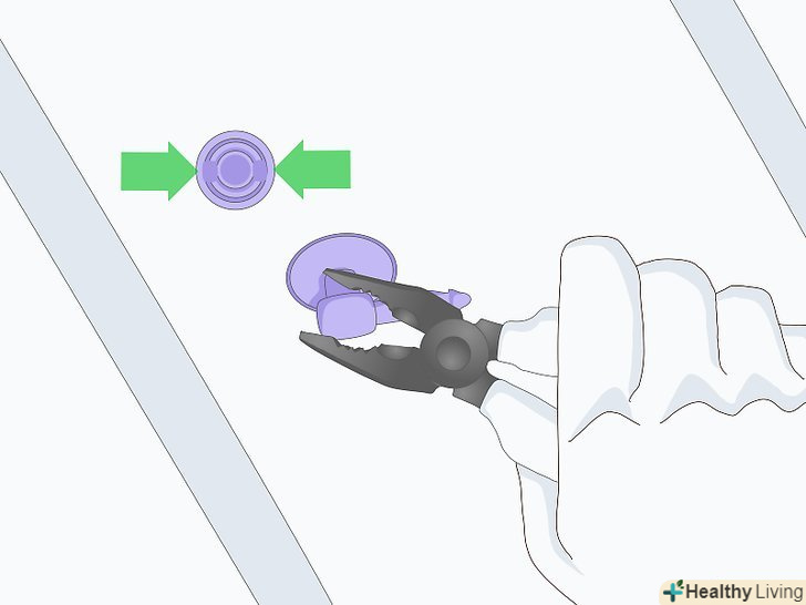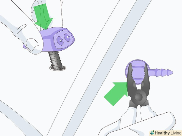 Використовуйте плоскогубці, щоб витягнути форсунку з капота.Форсунки склоомивача закріплені пластмасовими засувками. Візьміть плоскогубці і втисніть засувки в форсунку, а потім потягніть їх вгору.[6]- При натиснутій засувці форсунка повинна спокійно витягуватися з отвору в капоті.