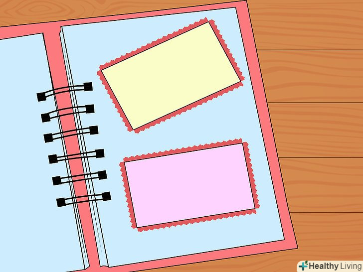Друку. вони також дуже допоможуть урізноманітнити сторінку, як і наклейки. Виберіть гумові друку, які підійдуть вам за тематикою і будуть гармоніювати за кольором зі знімками.- Перед застосуванням перевірте друк на окремому аркуші паперу. [3]