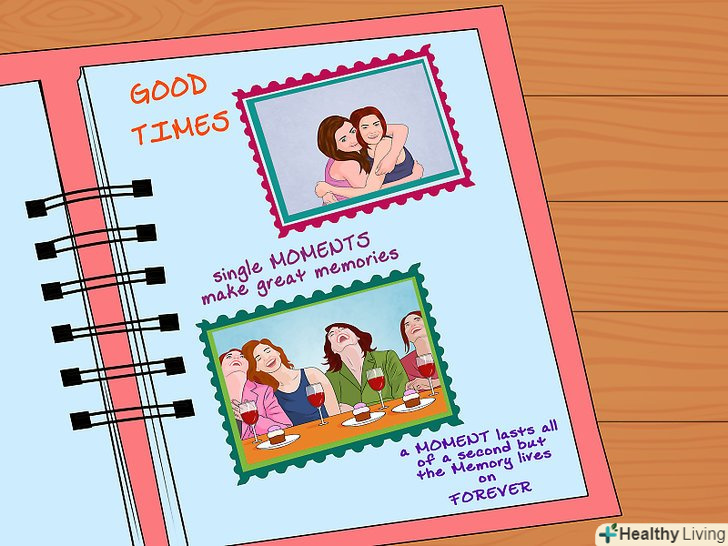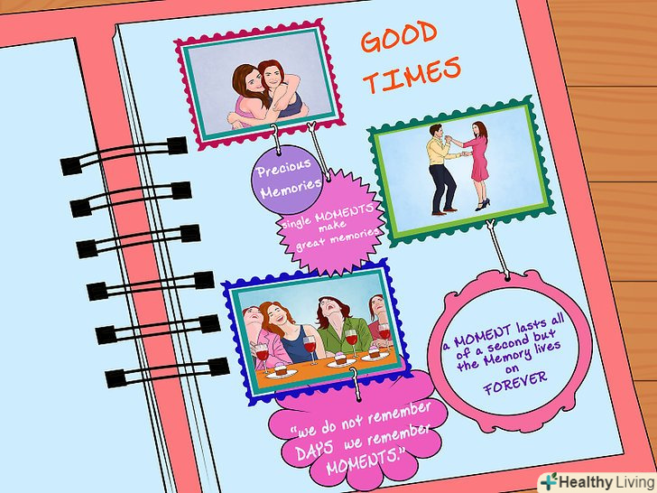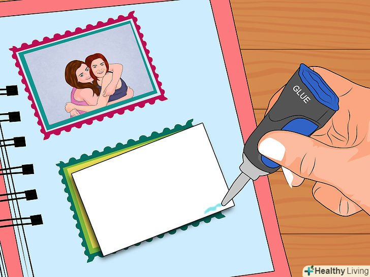 Приклейте все. не переборщіть з клеєм.- Це потрібно робити зверху вниз. Спочатку приклейте знімки на фоновий папір і чекайте, поки вони висохнуть. Потім фоновий папір слід приклеїти до сторінки.