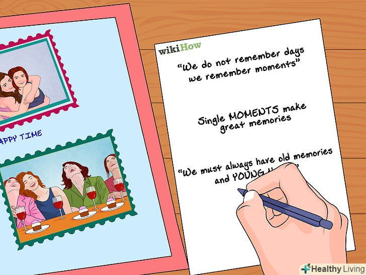 При бажанні додайте написи. якщо ви залишили місце поруч з кожною фотографією, то напишіть короткий заголовок за допомогою кулькової ручки або фломастера.- Зазвичай пишуть дату, місце і імена людей на фото.