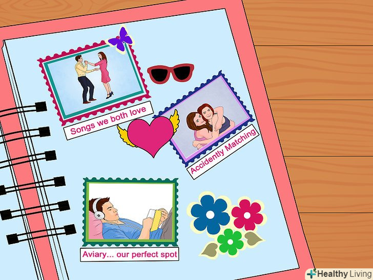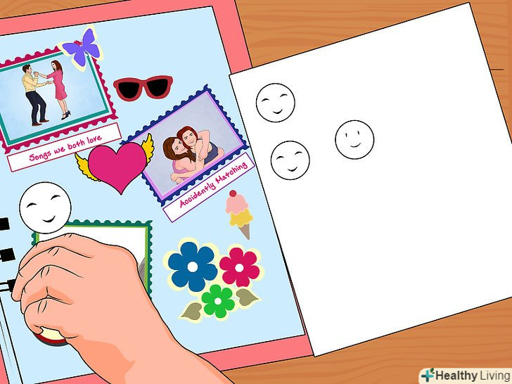Використовуйте наклейки. вам підійдуть будь-які, але краще брати ті, які не містять кислот. Добре виглядати будуть Тривимірні стікери.- Наклейки повинні відповідати категорії і тематиці фотоальбому. Наприклад, стікери-черепашки підходять для пляжу, футбольні або баскетбольні м'ячі – для знімків зі спортивних змагань, серця або Троянди – для романтичної тематики.