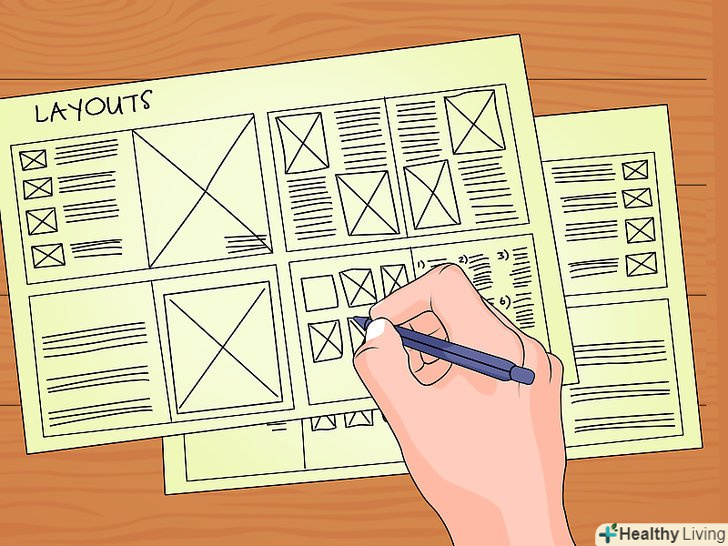 Заздалегідь вирішите, яким ви хочете бачити ваш альбом. не обов'язково планувати дизайн кожної сторінки, але, як мінімум, потрібно визначити, скільки сторінок ви хочете зробити, скільки знімків буде на кожній сторінці, яким буде дизайн, і скільки написів ви плануєте.- Запишіть ваші ідеї в зошит. Потім перегляньте свої записи і виберіть найкращі.