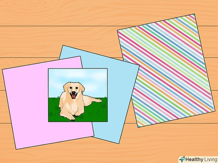 Папір повинен гармоніювати з фотографіями. для цього візьміть з собою кілька фотографій. Одноколірний папір повинен гармоніювати зі знімками, а папір з візерунками – поєднуватися з кольором і тематикою вашого альбому.- Вам знадобляться два аркуші звичайного паперу, а також один або два види декоративного паперу на кожну сторінку.