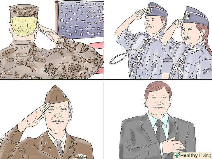 Зрозумійте етикет прапора . як потрібно вітати прапор і коли? Військові у формі, хлопчики і дівчатка скаути у формі, військові ветерани вітають прапор відданням військової честі, коли проходить парад, коли вимовляється клятва вірності, або коли грає національний гімн. Цивільні правою рукою знімають капелюхи і тримають їх над лівим плечем, або, якщо у них немає капелюхи, вони тримають праву руку над своїм серцем.