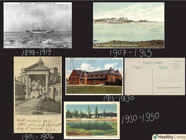 Ознайомтеся з періодизацією листівок. часто вкрай складно визначити, коли була випущена листівка, оскільки вона може бути надрукована коли і ким завгодно (і саме так завжди і було), але епоху, до якої належить листівка, можна визначити за деякими ознаками. [4]- 1898-1919 "золота ера" листівок; в цей час листівки досягли піку популярності.