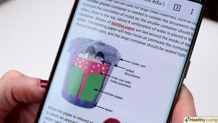 Вивчіть методи зволоження. як уже згадувалося в інших методах «» зволоження " паперу допоможе виправити складки, що утворилися при розриві або зміщенні волокон. Реставратори зазвичай користуються зволожуючими методами з величезною обережністю. Якщо ви налаштовані рішуче і у вас є кілька шматків паперу для тренування, можете спробувати такий метод перед тим, як гладити папір праскою. Найпростіший спосіб - так званий "метод Хортона". Скрутіть аркуш паперу в рулон, помістіть його у відкритий пластиковий стакан, поставте склянку у великий пластиковий контейнер, налийте туди води, закрийте його кришкою. [6]- Це може спровокувати утворення цвілі на папері, а з цим вже буде важко впоратися в домашніх умовах. Деякі архівісти використовують протигрибкові хімічні речовини, такі як тимол або орто-феніл фенолу, але ці матеріали можуть завдати шкоди папері, якщо використовувати їх неправильно. [7]