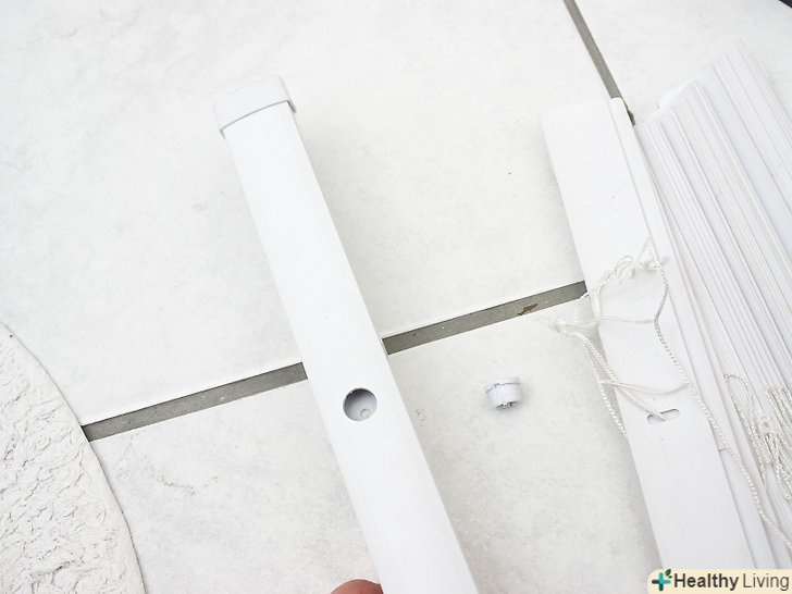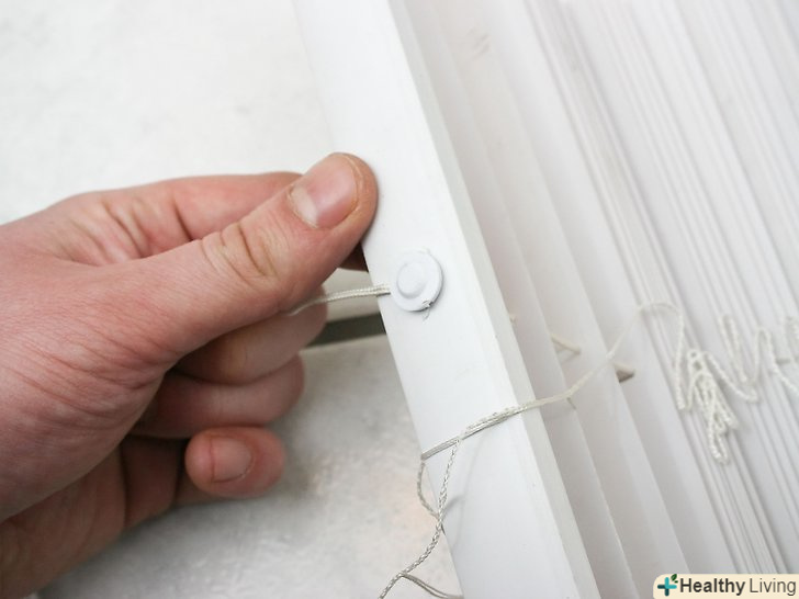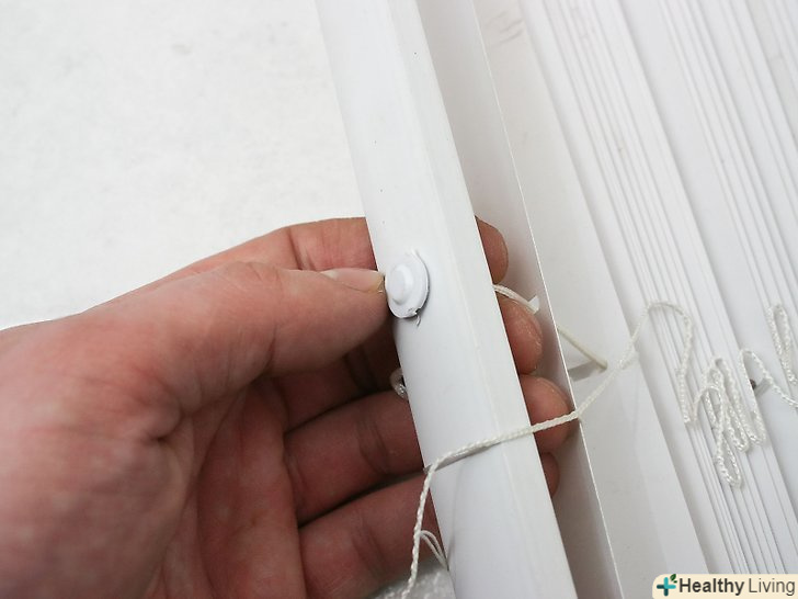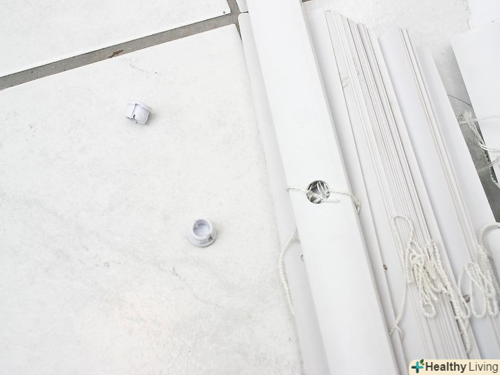 Видалити заглушки. міні-жалюзі забезпечені пластиковими кришками на нижній стороні нижньої направляючої. Більшість наборів жалюзі матимуть 3 пробки на всій довжині пластини. Видалення пробки дозволяє отримати доступ до підйомного шнура і 3 струнних сходів на міні-жалюзі. [1]- Зазвичай, ви можете просто взяти і вийняти заглушки без необхідності робити що-небудь додатково.