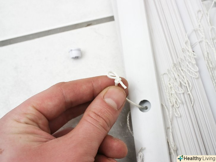 Підключіть підйомних шнурів, і зав'яжіть новий вузол на кожному з 3 кінців. використовуйте рулетку, щоб переконатися, що вузли знаходяться в ідеальному положенні, так що шнури мають однакову довжину, і пластини жалюзі буде висіти рівно.