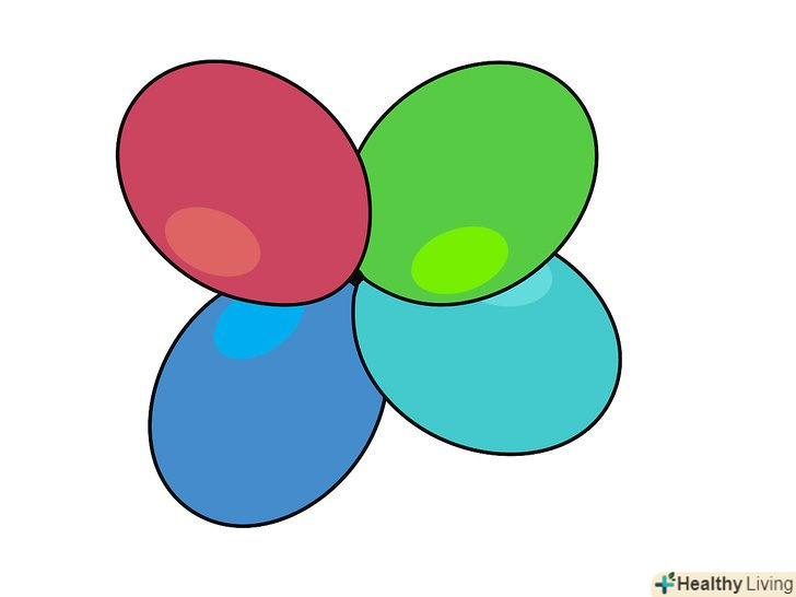 Надуйте чотири кулі за допомогою насоса. Всі вони можуть бути одного або різного кольору. Відразу ж після того, як наповніть кожен куля повітрям, зав'язуйте його хвостик вузлом. Постарайтеся зробити всі кулі однаковими за розміром. [1]- Для даного методу використовуйте звичайний насос, а не балон з гелієм.
