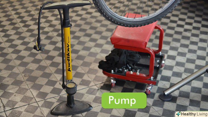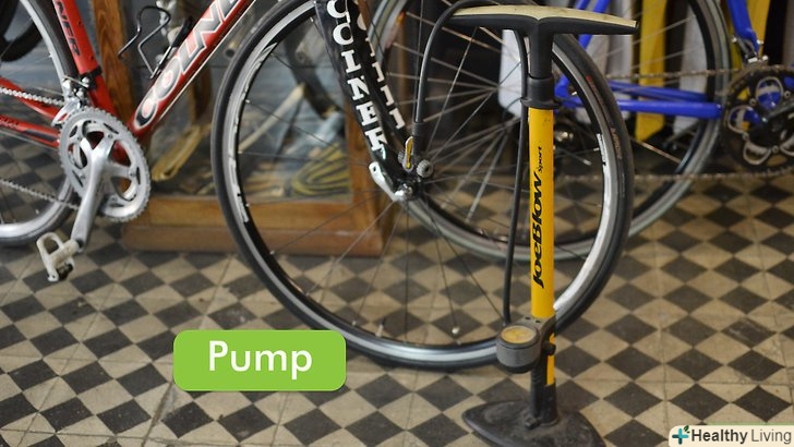 Приготуйте насос.скористайтеся компресором на заправці або попросіть у друга насос. При бажанні, ви можете купити його в найближчому веломагазині.- Щоб накачати колеса компресором на заправці, вам буде потрібно маленький ковпачок-перехідник. Накрутивши його на Спортивний ніпель, поверх ви зможете надіти головку, розраховану на автомобільний. Деякі старі велосипедні насоси також вимагають застосування перехідника; придбати його можна в найближчому веломагазині. Попросіть у заправника шланг з манометром і накачайте колеса серією коротких подач, кожен раз контролюючи тиск по приладу. Компресори на заправках надзвичайно потужні, і якщо ви не будете стежити за процесом, то легко можете розірвати велосипедні камери надлишковим тиском.