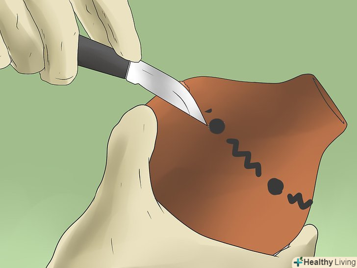 - Якщо ви збираєтеся глазурувати керамічні вироби з дітьми, то простіше буде пропустити цей крок і приклеїти до черепок, які будуть глазурувати діти, на клей для гарячого склеювання глиняний диск, який буде збирати краплі глазурі і відклеїться при випалюванні. [8]
