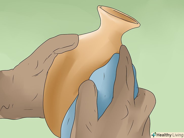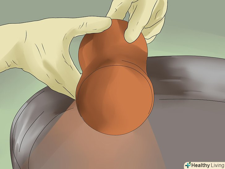 Глазуровка зсередини глечиків і іншого посуду з вузькими шийками. якщо вам належить глазурувати керамічний горщик, кухоль або іншу посудину зсередини, буває важко повністю покрити його глазур'ю за допомогою кисті. Замість цього можна налити невелику кількість глазурі в посудину і, нахиливши його набік, повільно крутити в руках, щоб глазур рівномірно розтеклася. Природно, на руках повинні бути надіті рукавички. [13]