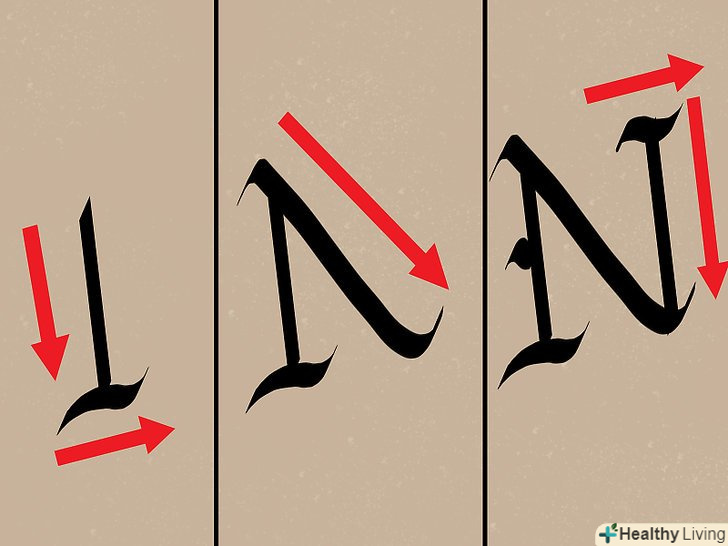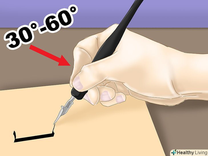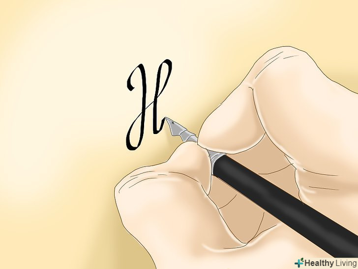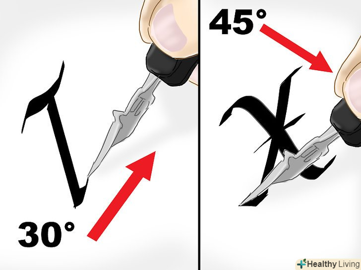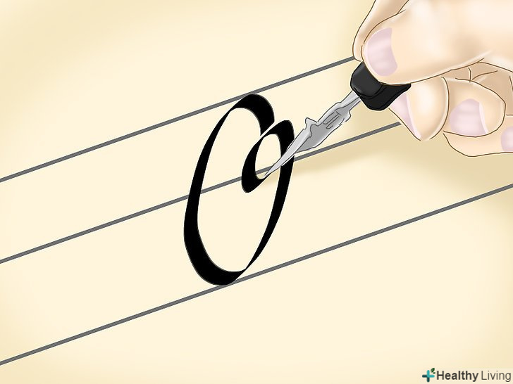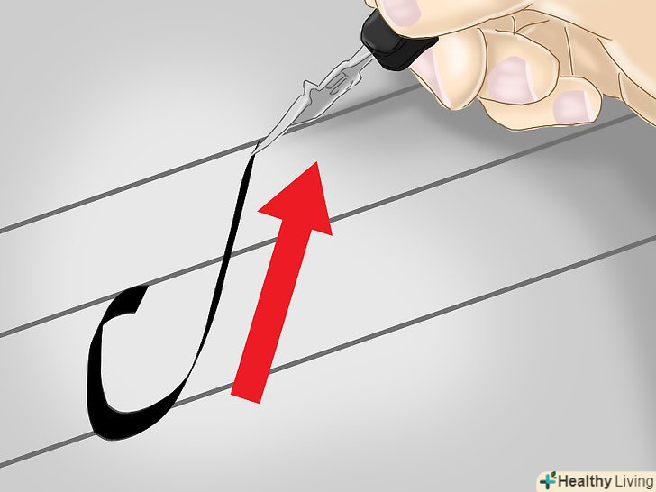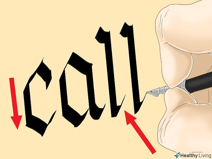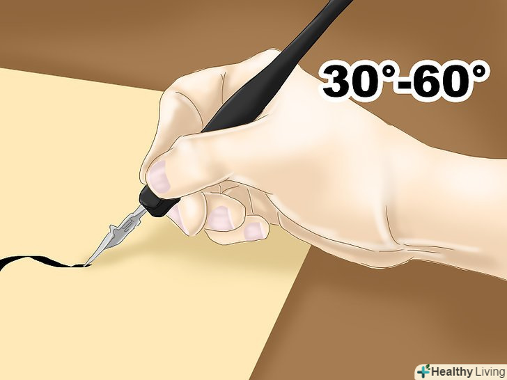 Тримайте перо під кутом 30°. кут може трохи змінюватися в процесі роботи, проте важливо пам'ятати, що, зберігаючи кут нахилу незмінним, вам вдасться створити однакові літери. [10]
