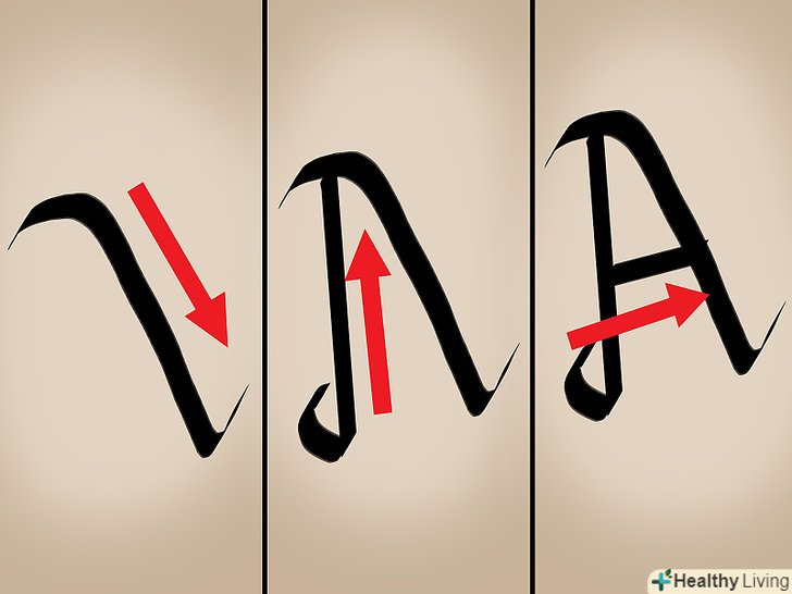 Напишіть букву "a" в три рухи. Буква "a" особлива — вона пишеться в три рухи. Візьміть перо під кутом 45°. Щоб написати хвостик, проведіть лінію вправо і вгору, а потім вниз і направо. Завершіть лінію хвостиком, спрямованим вгору і направо. Відірвіть руку від паперу і напишіть нижню частину овалу, провівши лінію зліва направо і вниз. Потім напишіть верхню частину овалу, провівши пряму лінію, яка з'єднається з початком другого штриха. [15]