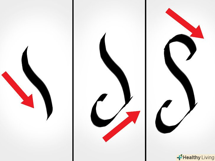 Не тисніть на перо занадто сильно. кожен штрих повинен бути плавним. Перо можна вести назад, вперед і в сторону. Долоню, зап'ястя, передпліччя і лікоть не повинні торкатися столу. Завдяки такому положенню руки руху вийдуть легкими. [5]