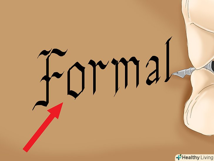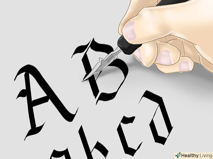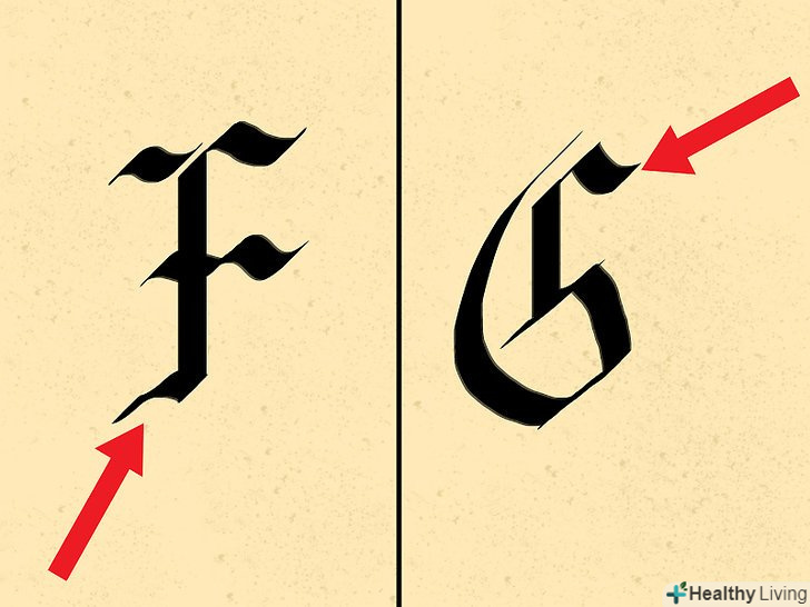 Спробуйте писати букви в готичному стилі. цей стиль характеризується широкими квадратними формами букв. Букви пишуться однаковими вертикальними штрихами. Готичний шрифт може використовуватися для створення особливої атмосфери на обкладинках книг і музичних альбомів, на плакатах і в титрах фільмів. Готичний шрифт також використовують в оформленні дипломів і сертифікатів, які видаються за певні досягнення. [9]