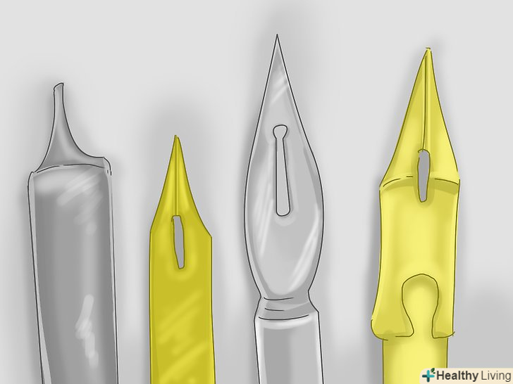 Купуйте різні пір'я. Каліграфічне перо, на відміну від звичних нам ручок, має широку і плоску поверхню. Така конструкція дозволяє створювати контраст між тонкими і тонкими лініями, завдяки чому каліграфічні шрифти виглядають вишукано. Пір'я бувають різних розмірів, тому купіть кілька і поекспериментуйте з ними. [2]