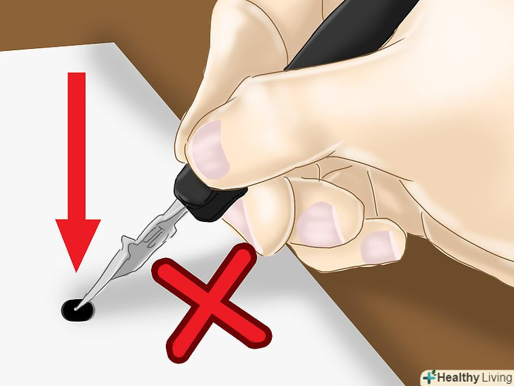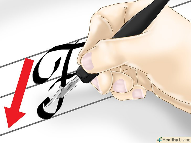 Тримайте перо під одним кутом. важливо завжди тримати перо так, щоб його кут нахилу не змінювався. Перо має дивитися в ліву сторону і нахилятися під кутом 30°-60°. У кожного шрифту свій нахил. Нахил також залежить від того, як ви тримаєте перо. [3]
