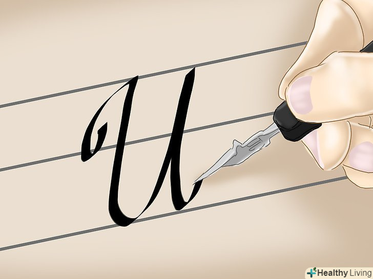 Напишіть букву "u". поставте перо на нижню лінійку. Проведіть основну лінію вгору, потім проведіть лінію вниз і напишіть хвостик вгору. Після цього поверніться до початку букви, проведіть лінію вниз і зігніть її, щоб дві лінії з'єдналися. [19]- Цей штрих є в буквах i, j, m, n, r, v, w і y.