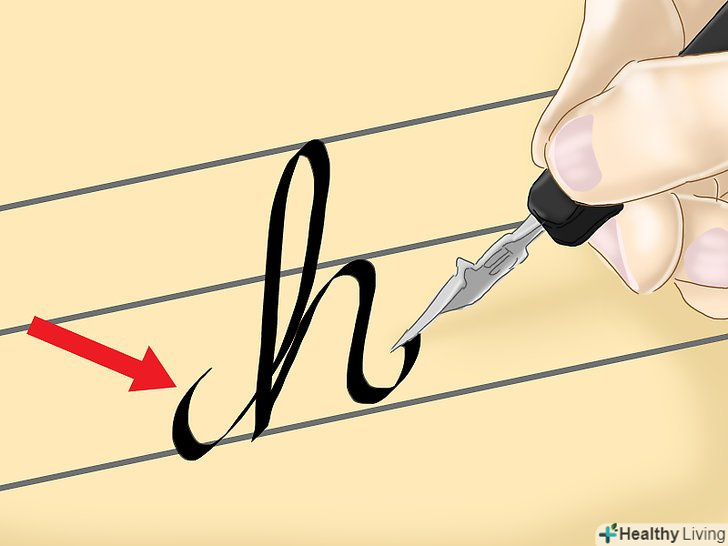 Напишіть букву "h". поставте перо на нижню лінійку і проведіть лінію вгору до верхньої лінійки. Потім зігніть лінію вліво і проведіть штрих вниз до нижньої лінійці, щоб дві лінії перетнулися внизу. Проведіть лінію вгору до середини і ще один штрих вниз. В кінці допишіть хвостик.- Букви b, f, k і l пишуться схоже.